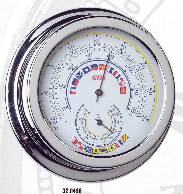 Kromirani mesingani termometar/higrometar u nautičkom stilu.